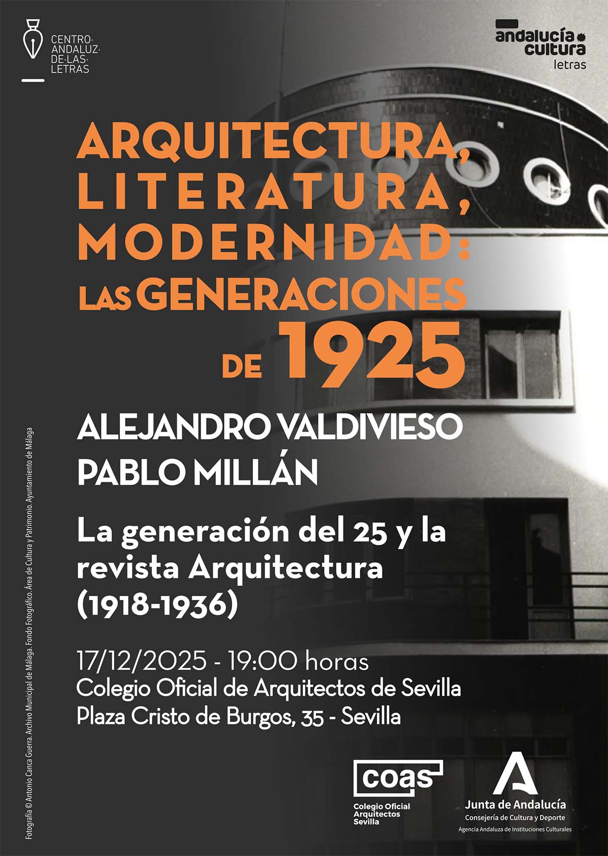 La actividad forma parte del ciclo “Arquitectura, Literatura, Modernidad: las Generaciones de 1925”, organizado por el Centro Andaluz de las Letras en colaboración con el COAS.