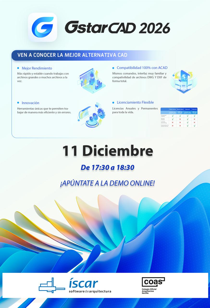 Como os comentamos recientemente, los colegiados y colegiadas del COAS pueden acceder a una promoción especial en la adquisición del software GstarCAD. En este contexto, el próximo 11 de diciembre, de 17:30 a 18:30 horas, tendrá lugar un webinar de presentación de GstarCAD 2026, organizado por Íscar Software de Arquitectura.