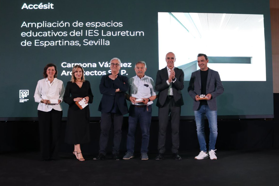 Por su parte, Laureano Matas, secretario del Consejo Superior de Colegios de Arquitectos de España (CSCAE), y Noemí Sanchís Morales, presidente del Consejo Andaluz de Colegios Oficiales de Arquitectos (CACOA), entregaron el segundo premio a la excelencia a José Antonio Carbajal Navarro, Gonzalo Díaz Recasens, José García Tapial, Fernando Mendoza Castells y Francisco Torres Martínez, porque “desde el rigor y el conocimiento, este grupo de arquitectos puso en el mapa la buena arquitectura sevillana con intervenciones en patrimonio en el proceso de su defensa. Tras una época de desarrollismo desaforado que acabó con gran parte de la huella patrimonial de numerosas arquitecturas en las que “no encontraban valores”, arquitectos con una vasta formación e ideas claras de cómo hacer convivir la ciudad con su pasado generaron instrumentos y herramientas para la intervención y conservación del patrimonio. Se valora también la capacidad de parte de ellos por generar una identidad de la escuela sevillana en arquitectura contemporánea, por abrir caminos desde el rigor y la entrega a esta profesión”.