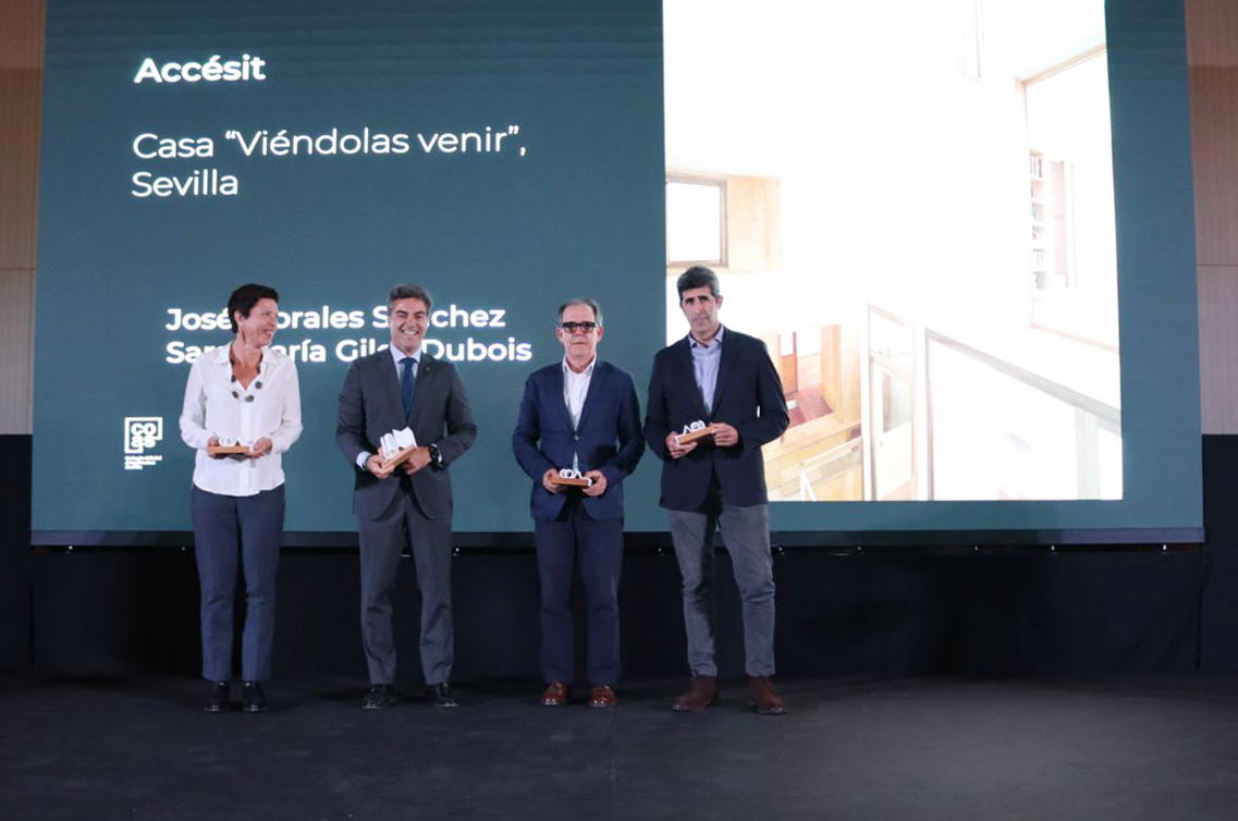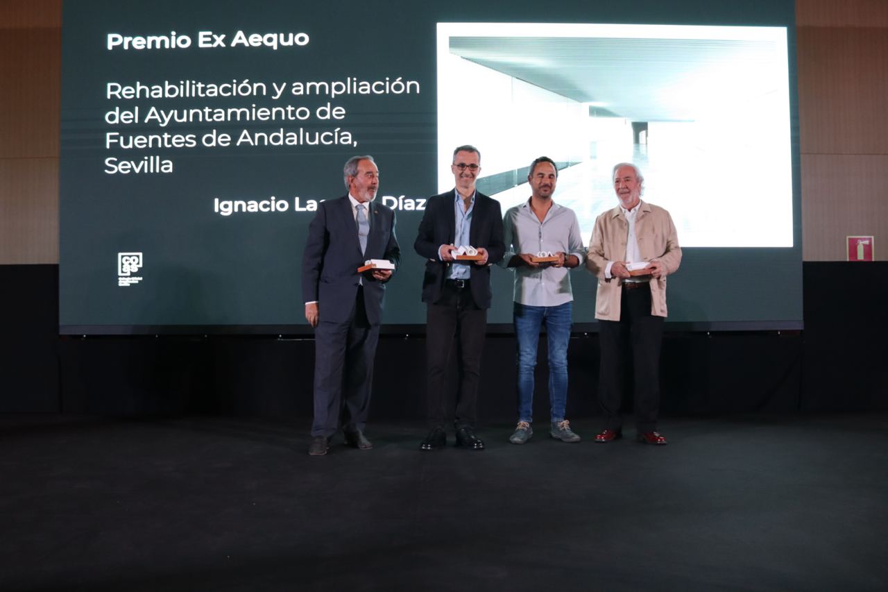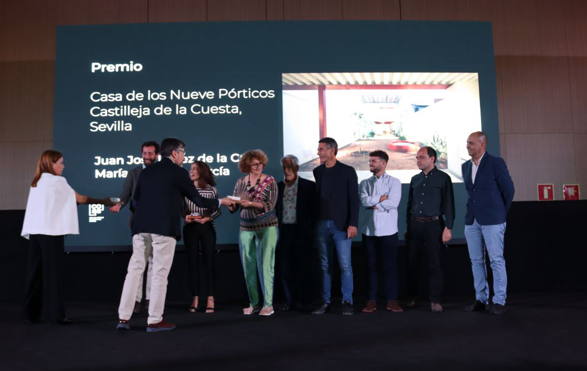 Tras sus palabras, se inició la entrega de premios. En primer lugar, Juan Carlos Montoya Vilches, Director del Área de Cohesión Territorial de la Diputación de Sevilla, fue el encargado de entregar los reconocimientos de la categoría Arquitectura de nueva planta - Uso residencial unifamiliar. El premio fue para la “Casa de los nueve pórticos en Castilleja de la Cuesta (Sevilla)” de Juan José López de la Cruz y María González García, del estudio Sol89, y los accésits para la “Vivienda unifamiliar aislada en Espartinas (Sevilla)” de Luis Ridao y la “Vivienda unifamiliar entre medianeras en la calle Constancia (Sevilla)” de Ramón Queiro Quijada.
