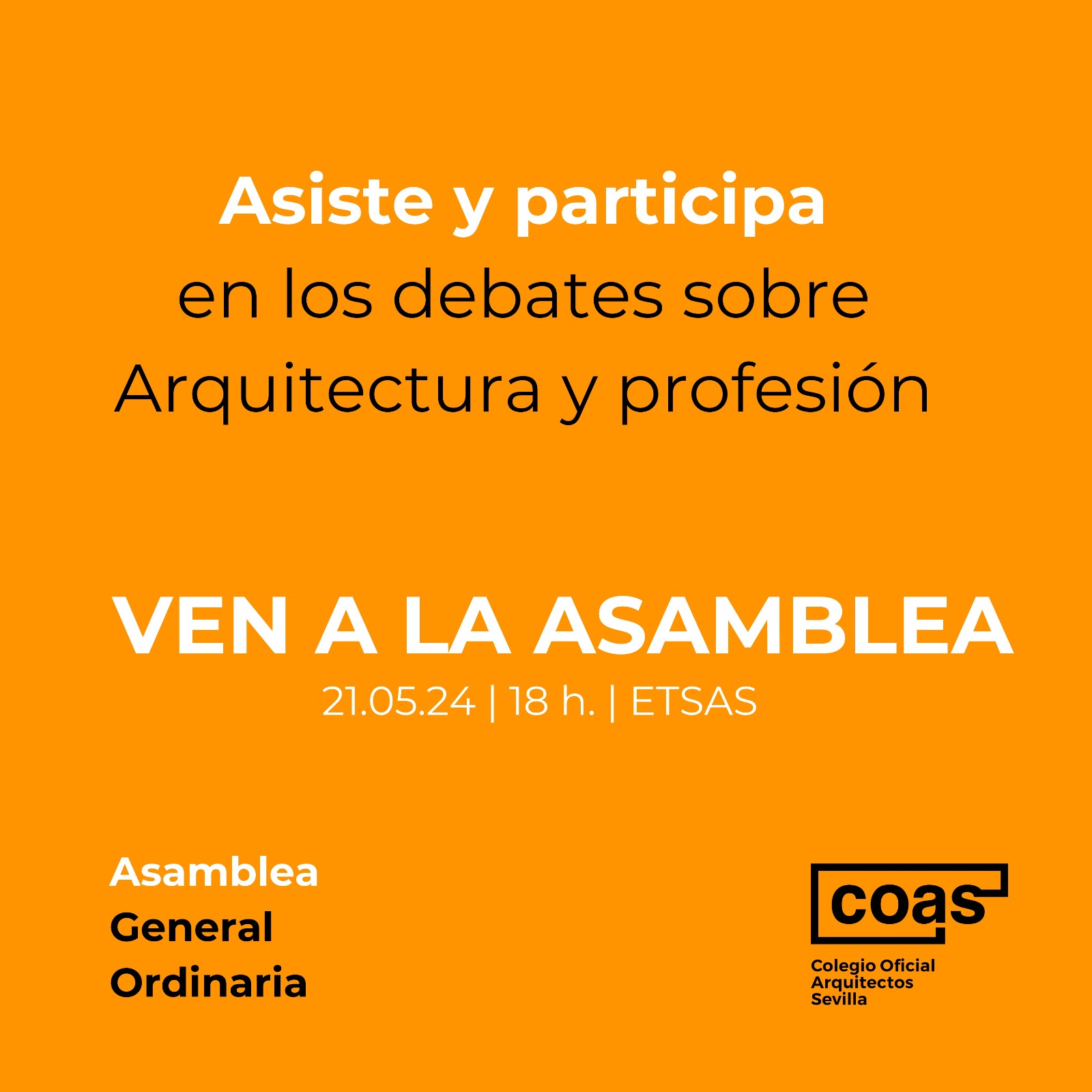 Os adjuntamos los enlaces a la convocatoria de la Asamblea General Ordinaria, que tendrá lugar el día 21 de mayo de 2024, a las 18 h. en primera convocatoria y a las 18:30 en segunda convocatoria, en el salón de actos de la Escuela de Arquitectura de Sevilla (Avda. Reina Mercedes 2, Sevilla), y al Documento de Representación correspondiente.