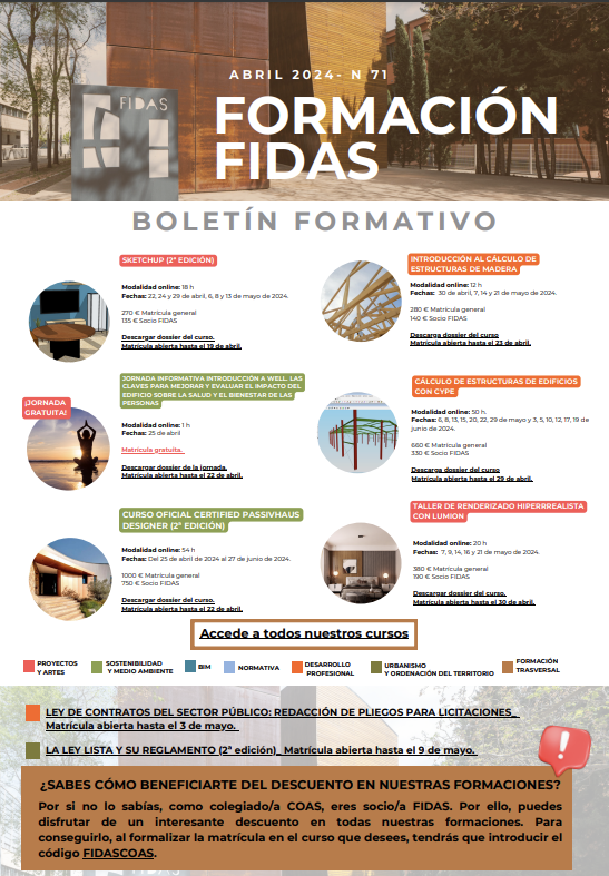 El  plan formativo del COAS  impulsado por la  Fundación FIDAS   y con el   patrocinio de ASEMAS , cuenta con un  amplio y completo catálogo de cursos  adaptado a la actualidad del sector, que tiene el objetivo de  impulsar la empleabilidad de los arquitectos y arquitectas , así como mejorar su cualificación profesional.