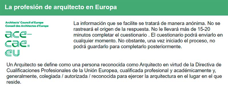 El Consejo de Arquitectos de Europa está realizando su séptimo Estudio Europeo de la profesión de arquitecto/a. Las encuestas se realizan cada dos años y permiten observar los cambios que ha experimentado la profesión, en particular a la luz de la evolución de la coyuntura económica.
