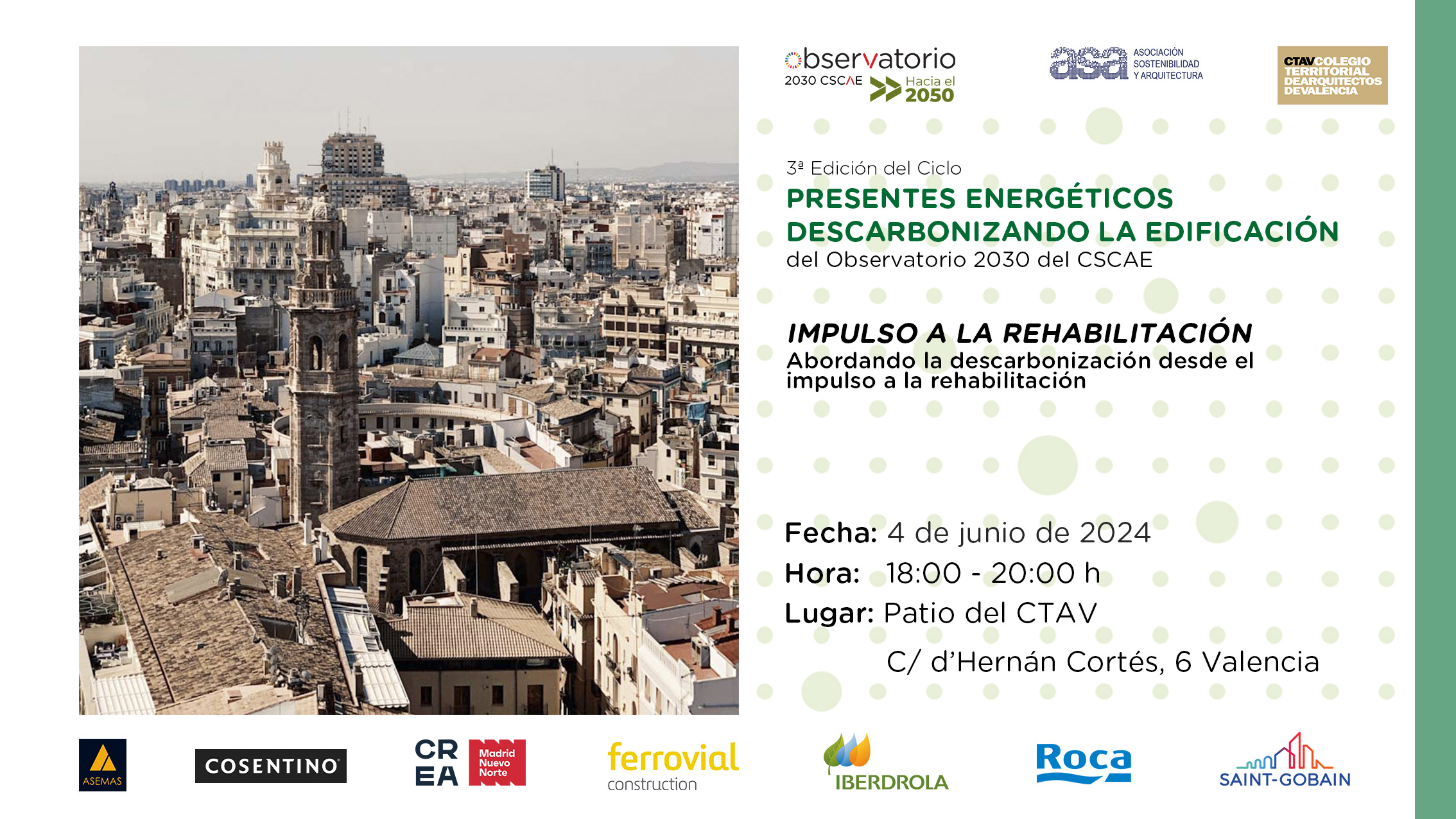 El quinto taller del III Ciclo Presentes Energéticos: Descarbonizando la edificación. Impulso a la Rehabilitación, dedicado a la rehabilitación sostenible y organizado por el Observatorio2030 del CSCAE y la Asociación Sostenibilidad y Arquitectura (ASA), en colaboración con los Colegios de Arquitectos, se celebrará el martes 4 de junio, de 18 h.-20 h., en el Colegio Territorial de Arquitectos de Valencia (Calle d'Hernán Cortés, 6 Valencia).