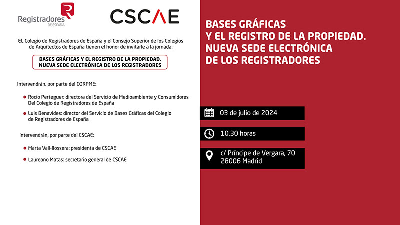 El encuentro contará con Rocío Perteguer, directora del servicio de medioambiente y consumidores del Colegio de Registradores de España; Luis Benavides, director del servicio de bases gráficas del Colegio de Registradores de España; Marta Vall-llossera, presidenta de CSCAE, y Laureano Matas, secretario general de CSCAE