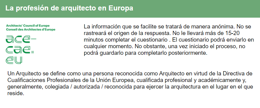El Consejo de Arquitectos de Europa (CAE) está realizando su séptimo Estudio Europeo de la profesión de arquitecto/a. Las encuestas se realizan cada dos años y permiten observar los cambios que ha experimentado la profesión, en particular a la luz de la evolución de la coyuntura económica.