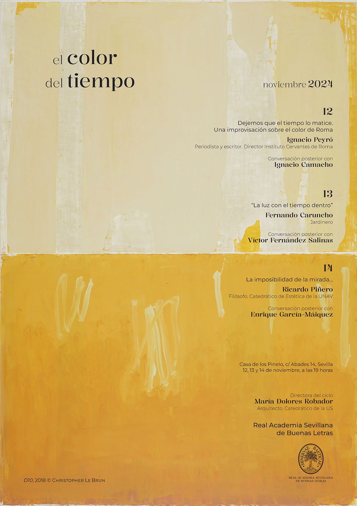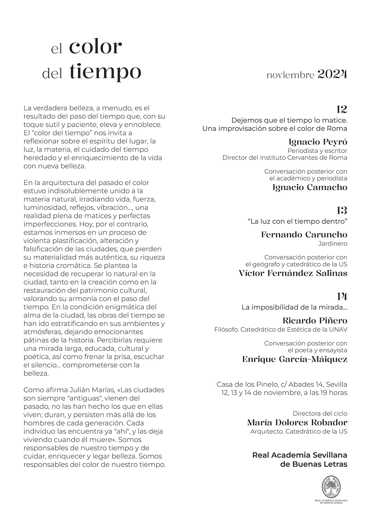 Dirigido por la colegiada, arquitecta y catedrática de la Universidad de Sevilla, Lola Robador, el ciclo ‘El Color del Tiempo. Conferencias y conversaciones sobre la luz, la materia y la belleza’ tendrá lugar en la Real Academia Sevillana de Buenas Letras (Calle Abades, 14, Sevilla), del 12 al 14 de noviembre de 2024. Las sesiones tendrán lugar a las 19 horas, y la entrada será libre hasta completar aforo.