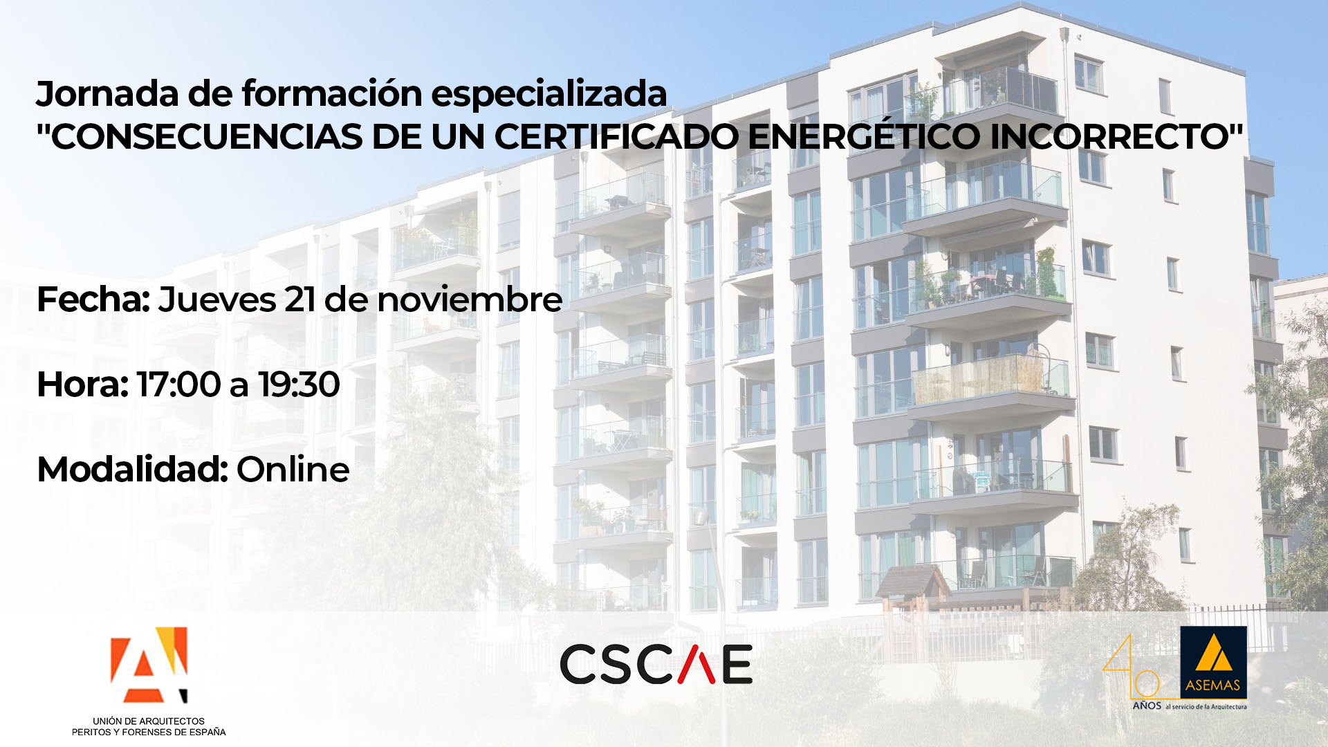 La Unión de Arquitectos Peritos Forenses de España (UAPFE) y el Consejo Superior de los Colegios de Arquitectos de España (CSCAE), con la colaboración de ASEMAS, organizan la jornada de formación especializada "Consecuencias de un Certificado Energético Incorrecto". El encuentro tendrá lugar el 21 de noviembre, de 17:00 a 19:30 horas, y será transmitido en formato online vía streaming desde ASEMAS Bilbao (Gran Vía, 2).