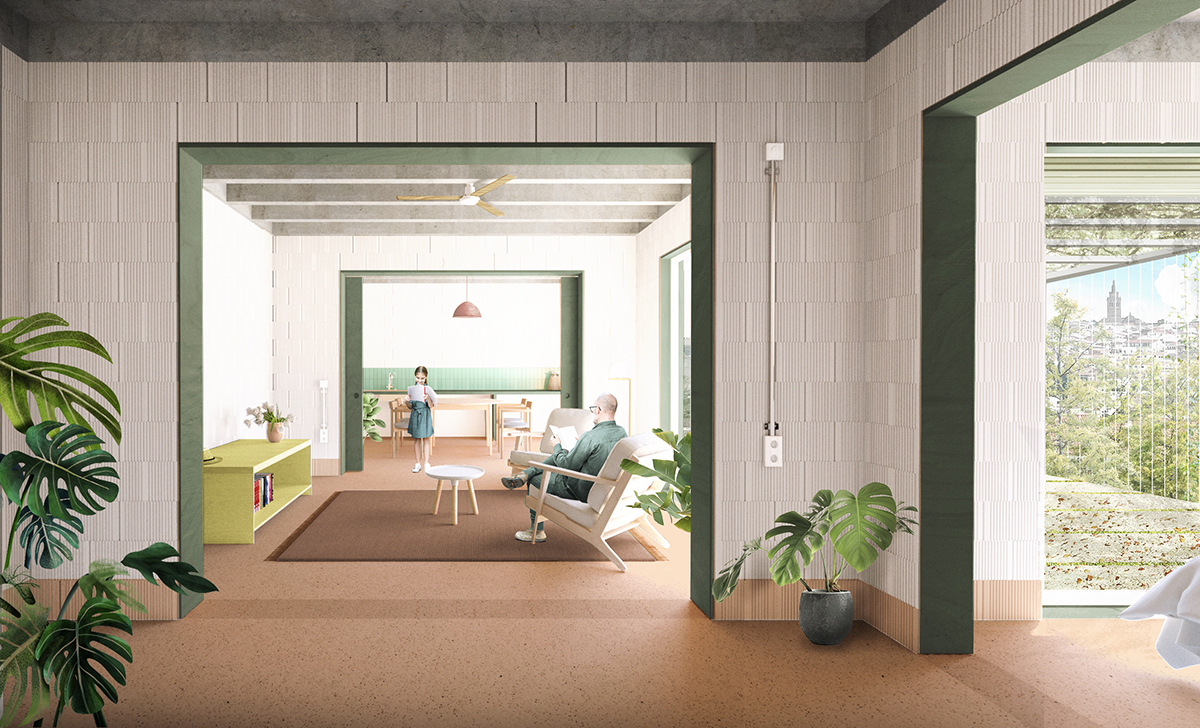 Cada vivienda se divide en dos plantas, permitiendo reducir la superficie de envolvente, dando lugar a una vivienda compacta y equilibrada. Un desarrollo que permite contar con todo el programa funcional mínimo en planta baja, y con dos habitaciones extra en planta primera. Este esquema permite que la habitación de planta baja pueda usarse como espacio polivalente (despacho, sala de juegos…) que puede ir mutando de uso y adaptarse al modo de vida de los usuarios, sin perder en ningún momento la privacidad de la planta superior. Los espacios servidores (aseos, núcleo de comunicación) se ubican en el área con menos luz y ventilación de la vivienda, optimizando la iluminación en el resto de las estancias, y ubicando las zonas vivideras en zonas con doble fachada, favoreciendo la ventilación natural de las mismas.