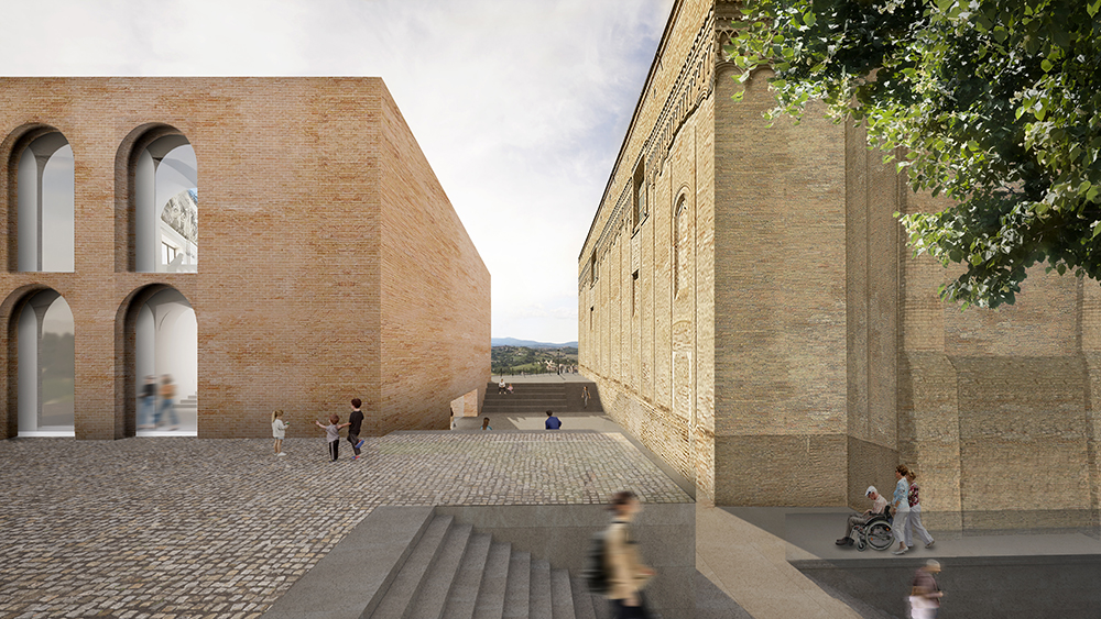 La propuesta ganadora tiene como principal objetivo la puesta en valor de los dos principales edificios históricos supervivientes que pertenecieron al conjunto conventual de San Francisco, la antigua Iglesia y la Escalera del Panfili (Pio Panfili, arquitecto y pintor del siglo XVIII). Para lograrlo se propone la demolición de los edificios construidos en los años 50 adosados a la iglesia y la creación de un nuevo espacio público, interpuesto entre los dos edificios existentes. Esto se consigue reduciendo significativamente la nueva volumetría prevista en el programa, mediante la decisión de localizar la parte menos representativa y pública dentro de un basamento funcional, en el zócalo histórico existente -la parte residual de las murallas de la ciudad- bajo el nivel de la plaza del Convento.