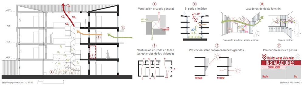Por otro lado, esta tipología puesta en práctica cuenta con numerosas ventajas en el ámbito climático. La separación de las piezas, así como su disposición en torno a un patio permite una ventilación cruzada total, un aislamiento acústico pasivo entre viviendas y la generación de un microclima que autorregula los espacios comunes.