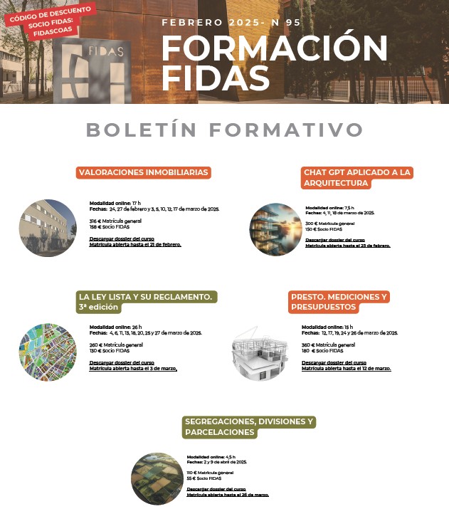 Los títulos con plazo abierto de matriculación son los siguientes: Valoraciones inmobiliariasChat GPT aplicado a la arquitectura, La Ley LISTA y su reglamento. 3ª edición, PRESTO. Mediciones y presupuestos y Segregaciones, divisiones y parcelaciones