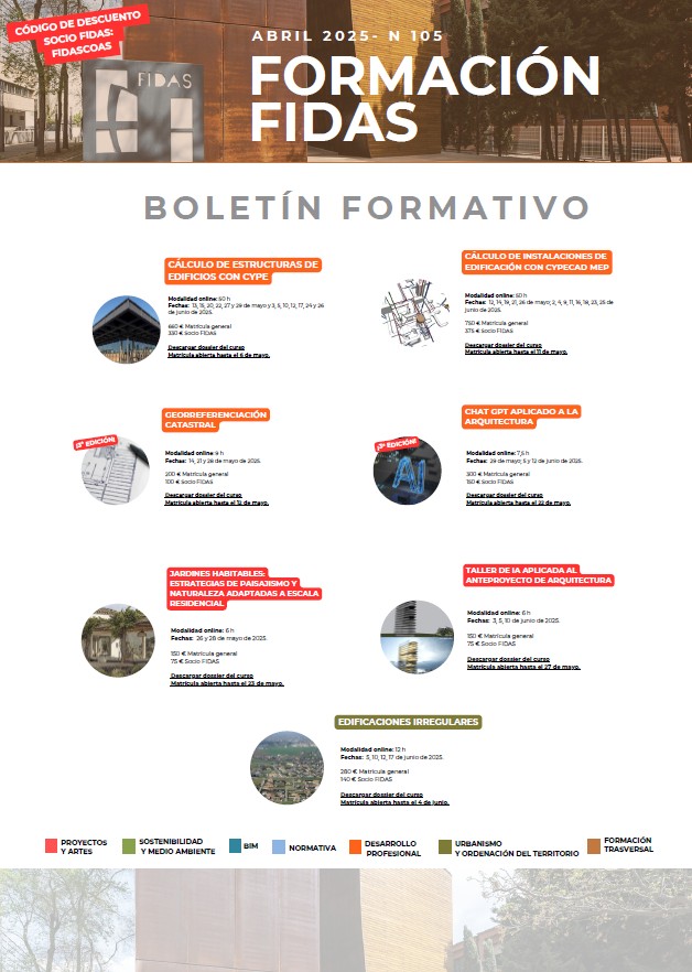 Los títulos con plazo abierto de matriculación son los siguientes: Cálculo de estructuras de edificios con CYPECálculo de instalaciones de edificación con CYPECAD ME; Georreferenciación catastralChat GPT aplicado a la arquitecturaJardines habitables: Estrategias de paisajismo y naturaleza adaptadas a escala residencialTaller de IA aplicado al anteproyecto de arquitectura, y Edificaciones irregulares