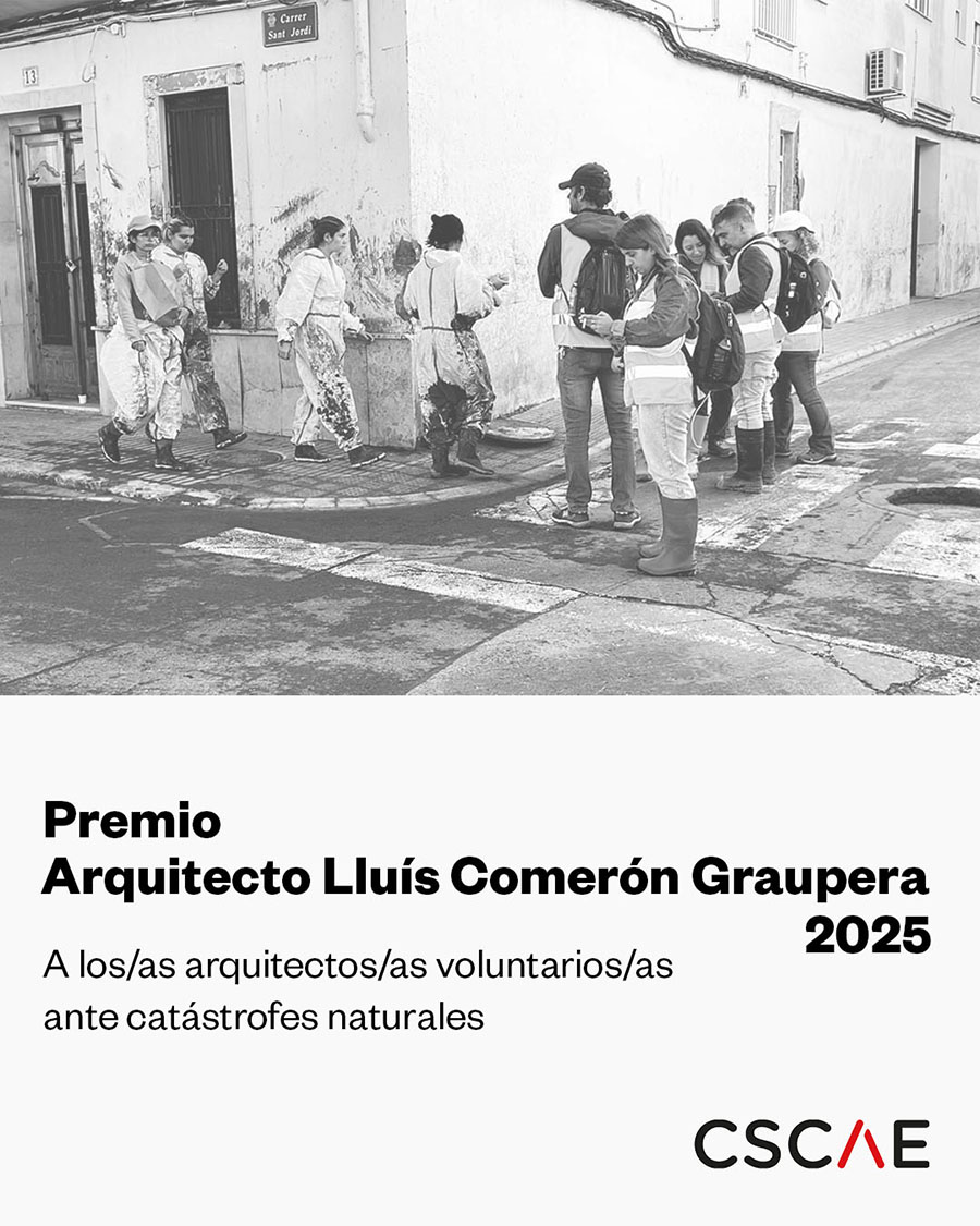 El Consejo Superior de los Colegios de Arquitectos de España (CSCAE) concederá el Premio “Arquitecto Lluís Comerón Graupera” a la figura del arquitecto y arquitecta voluntarios/as. Con ello, reconoce “la actitud ejemplar de compromiso, generosidad y responsabilidad de numerosos/as compañeros/as por su labor desinteresada en situaciones de catástrofes naturales”. Por ejemplo, las acontecidas por la DANA que, el pasado otoño, se cebó, cruelmente, con Valencia y otros territorios del país, como Castilla-La Mancha o Andalucía; la erupción del volcán en Cumbre Vieja, en La Palma, en el año 2021, o el terremoto de Lorca, en Murcia, en 2011.