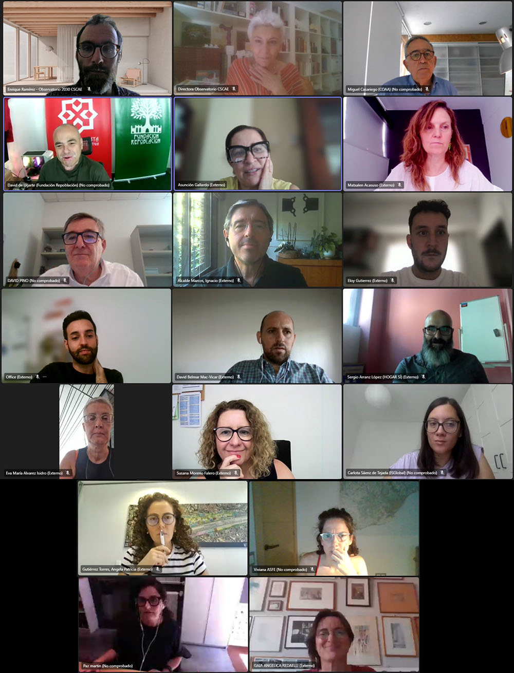 Liderada por el proyecto HabitaTU, a cuyo frente se encuentran las arquitectas Matxalen Acasuso y Paz Martin, y bajo la coordinación del Observatorio 2030 del CSCAE, la reunión, que se celebró de forma telemática, contó con la asistencia de CREA Madrid Nuevo Norte (CREAMN), el Instituto de Salud Global de Barcelona (ISGlobal), la Asociación Nacional de Empresas de Rehabilitación y Reforma (ANERR), la Federación de Consumidores y Usuarios (CECU), Helmet Homes, Hogar sí, Andalucía Emprende, la Fundación ONCE, la Fundación Repoblación, la Universidad Politécnica de Valencia (UPV), la ONG Prodiversa y Empresa de Inserción AdobeVerde, la Red Vivienda Cooperativa (REAS), la Asociación Vasca de Cohousing y los Colegios Oficiales de Arquitectos de Asturias y Castilla y León Oeste, entre otros.