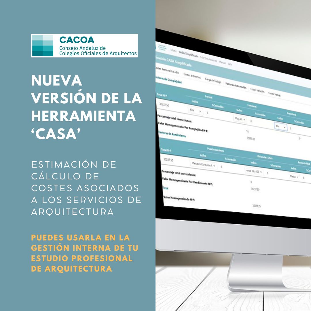 El Consejo Andaluz de Colegios Oficiales de Arquitectos (CACOA) ha lanzado la Herramienta de Costes Asociados a los Servicios de Arquitectura (CASA), cuya finalidad es facilitar el cálculo aproximado de los costes de producción de Arquitectura.