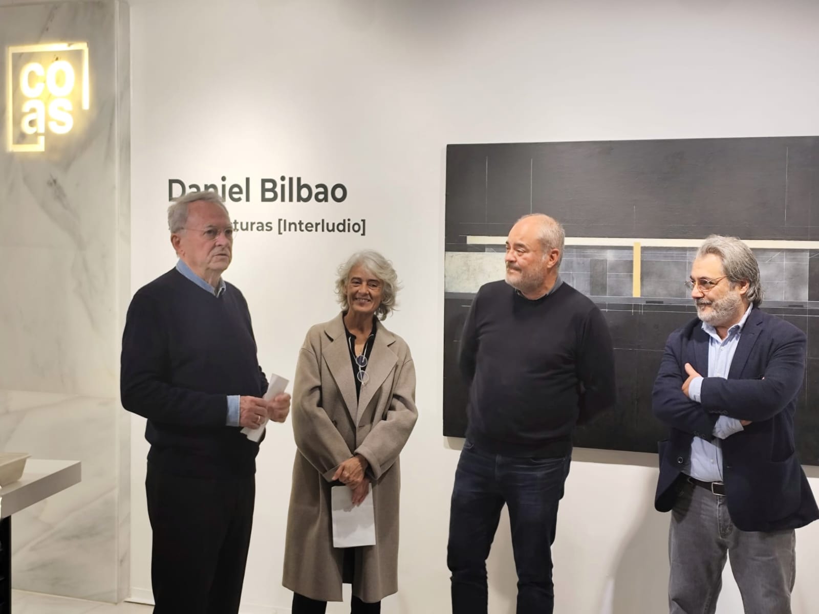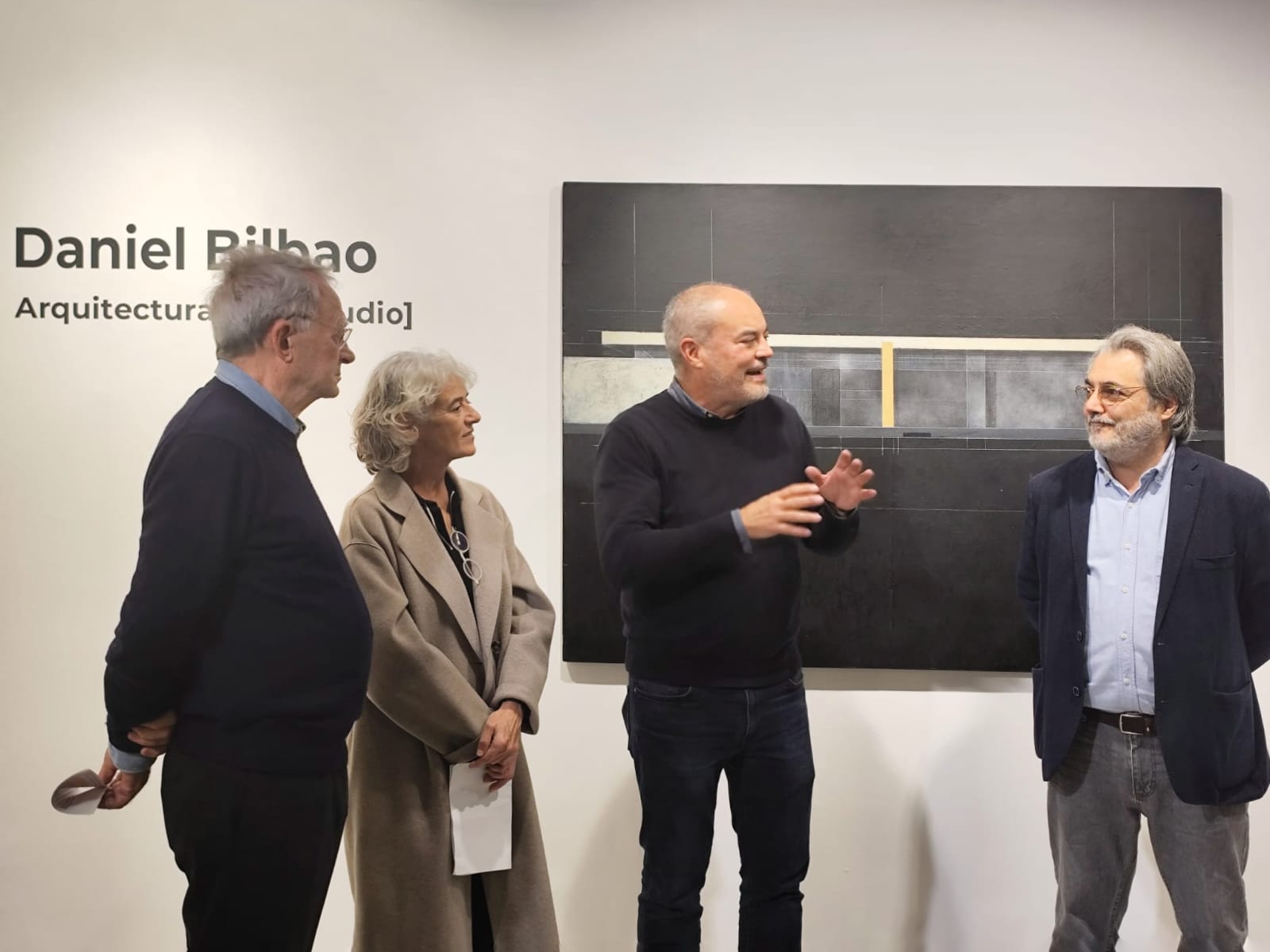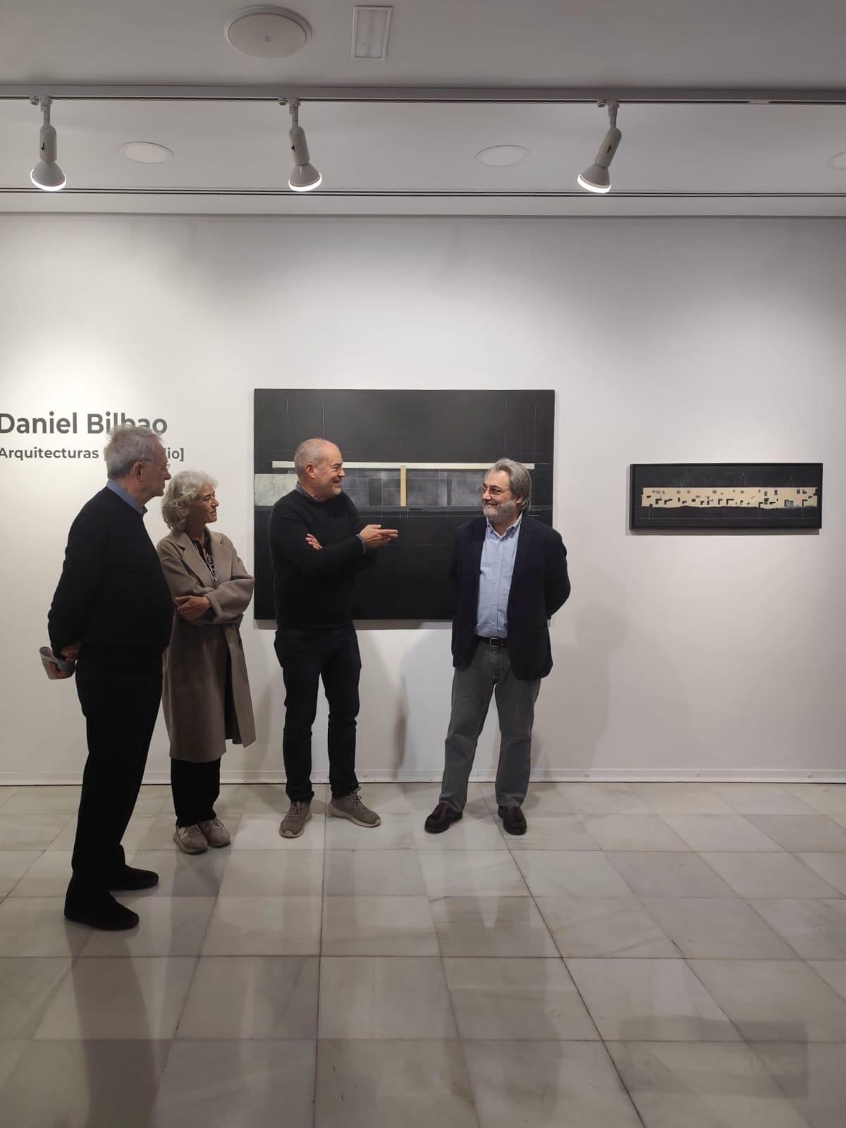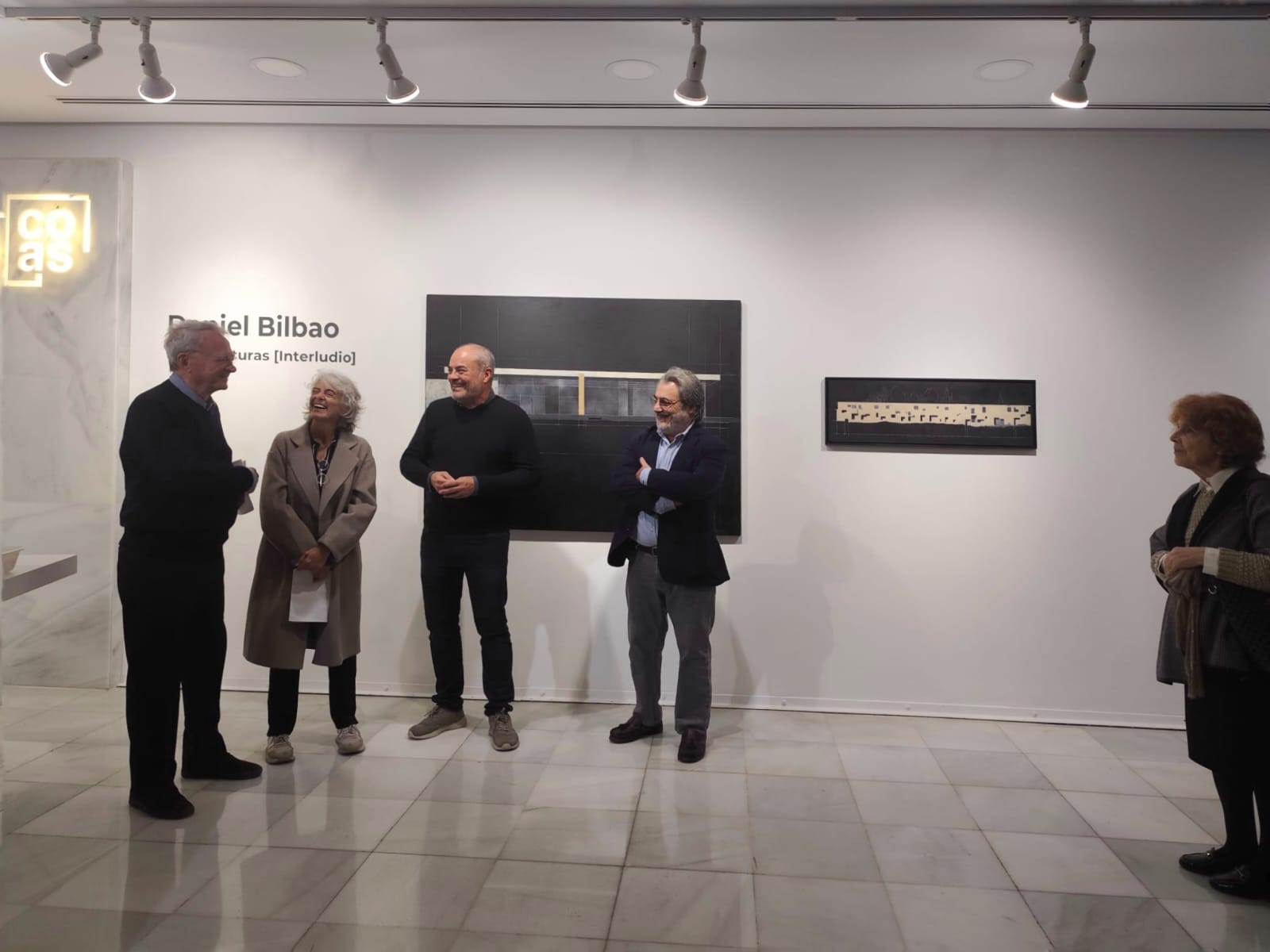 El acto de inauguración contó con la presencia del artista Daniel Bilbao y del comisario de la muestra, Juan Suárez, así como de Nuria Canivell, decana del COAS, y de Juanma García Nieto, coordinador de la exposición y vocal de Actividades.
