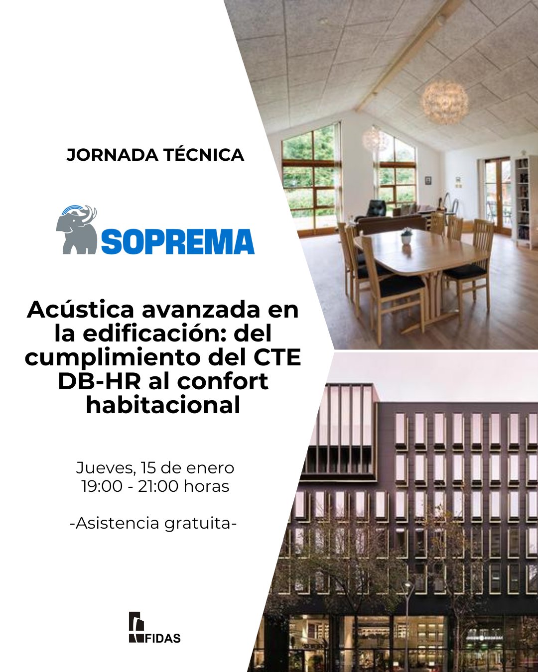 La Fundación FIDAS y la empresa Soprema Iberia organizan el próximo jueves 15 de enero, de 19:00 a 21:00 horas, la jornada técnica presencial "Acústica avanzada en la edificación: del cumplimiento del CTE DB-HR al confort habitacional", que se celebrará en el salón de actos de FIDAS (Avda. de Marie Curie, 3. Isla de la Cartuja. Sevilla).