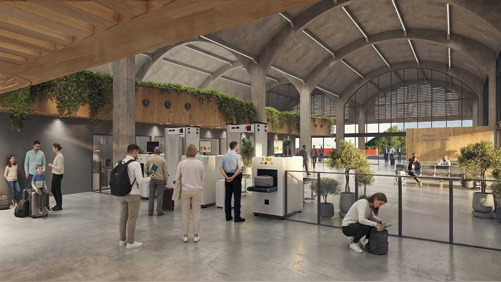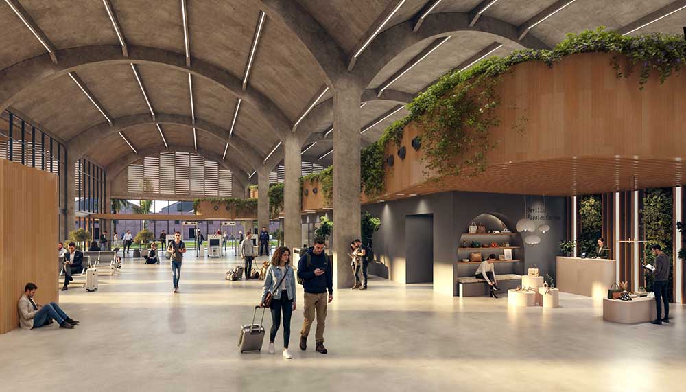 Los cerramientos de fachada que limitan el espacio interior de la terminal serán un ligero muro cortina de vidrio, para que no compitan con la estructura de hormigón. Los nuevos usos necesarios que obligan a tener espacios cerrados (oficinas, aseos, escáneres…) se albergan en piezas separadas de las fachadas y cuya altura no llega a las bóvedas para poner también en valor la estructura de hormigón interior. Su escala menor, su materialidad y el uso profuso de vegetación ayudará a humanizar el espacio además de permitir, con respeto, identificar fácilmente la preexistencia del añadido posterior.