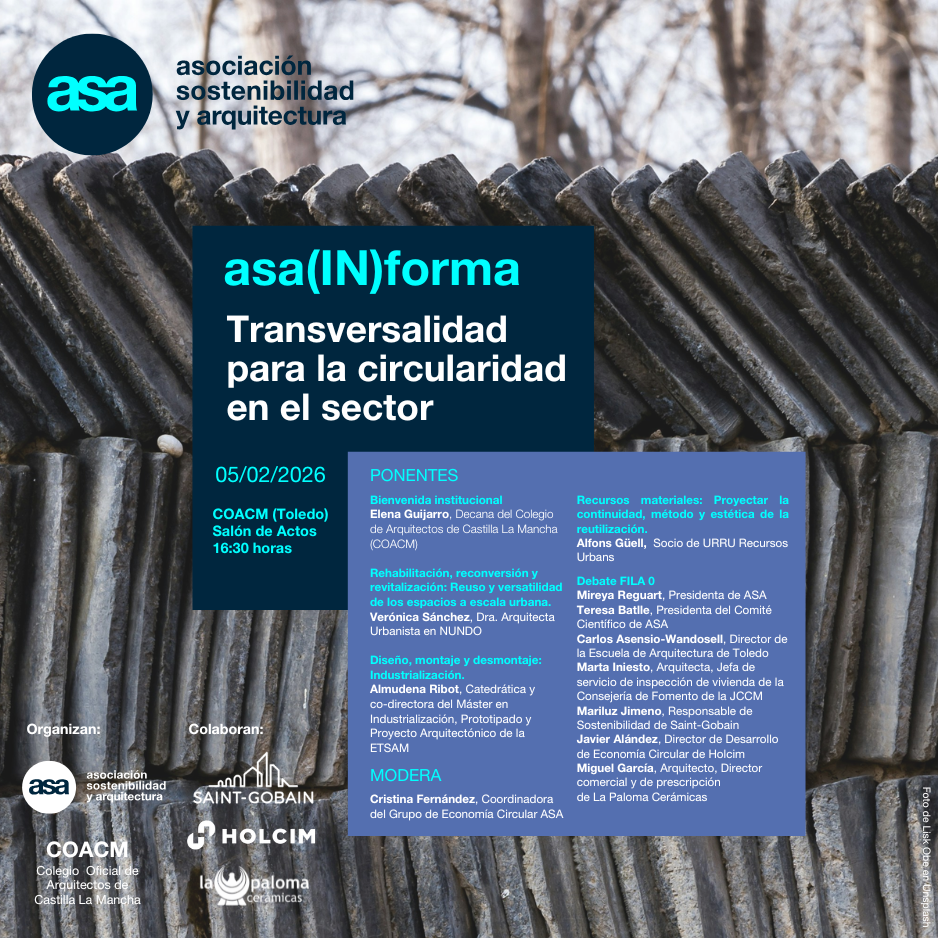 asa(IN)forma busca ser la plataforma desde la cual se impulsen y clarifiquen criterios sólidos en la arquitectura sostenible. En este contexto, el jueves 5 de febrero, a las 16:30 h., el Grupo de Trabajo de Economía Circular y Transformación de asa organiza, junto al Colegio de Arquitectos de Castilla-La Mancha (COACM), la jornada asa(IN)forma "Economía Circular y Transformación", que abordará la necesidad de fomentar las conexiones transversales en el sector de la construcción para garantizar el éxito en la aplicación de estrategias circulares en la arquitectura.