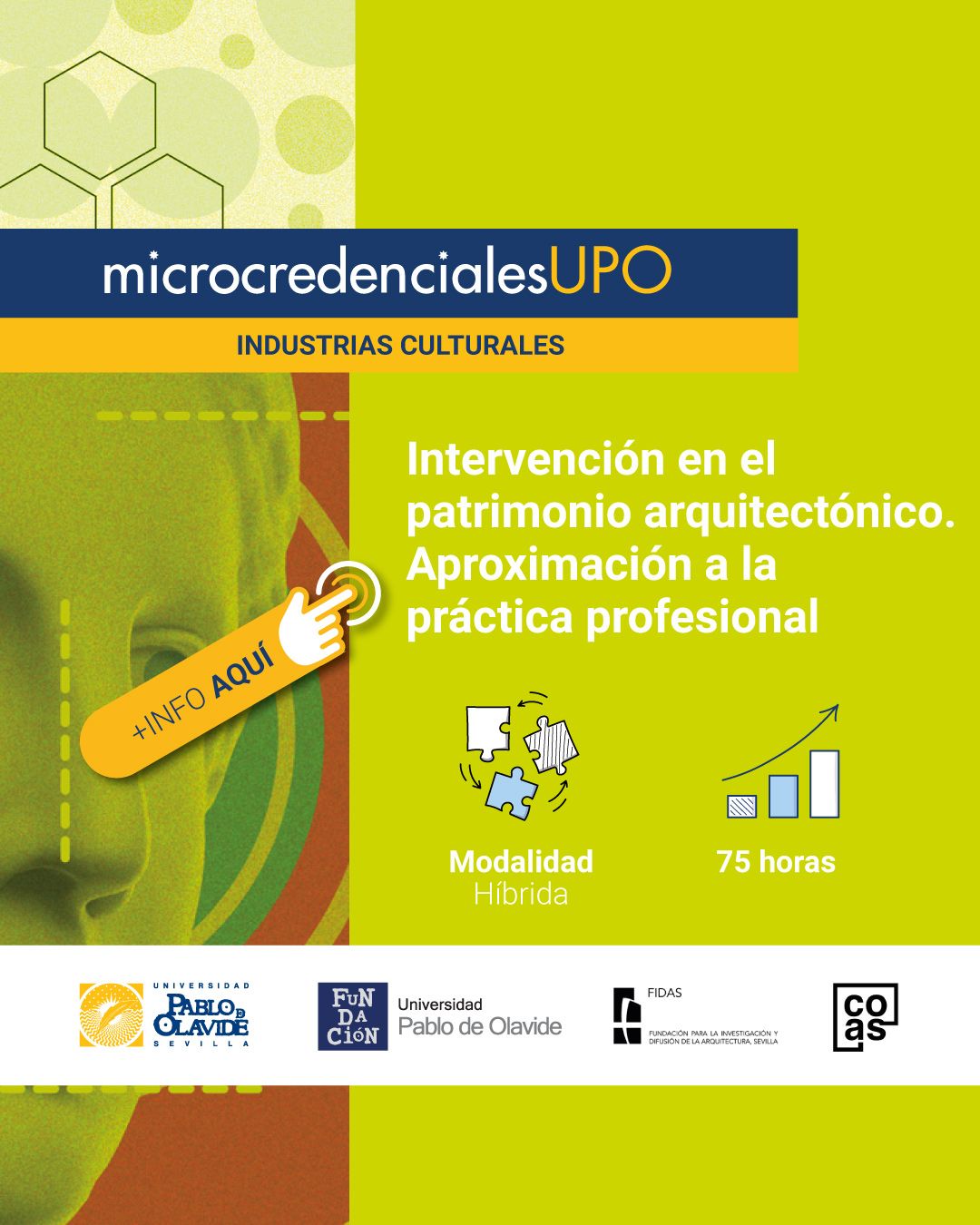 Por su parte, la microcredencial sobre patrimonio arquitectónico está orientada tanto a los profesionales que intervienen en la conservación patrimonial como a aquellos en este tipo de intervenciones especializadas, con el fin de reforzar y mejorar sus conocimientos. Parte de su contenido se encuentra vinculado a diferentes proyectos en los que participa el COAS como FIDAS, entre ellos “Sevilla Oculta”, iniciativa impulsada por el Ayuntamiento de Sevilla, el Arzobispado de Sevilla y la Cámara de Comercio de Sevilla.