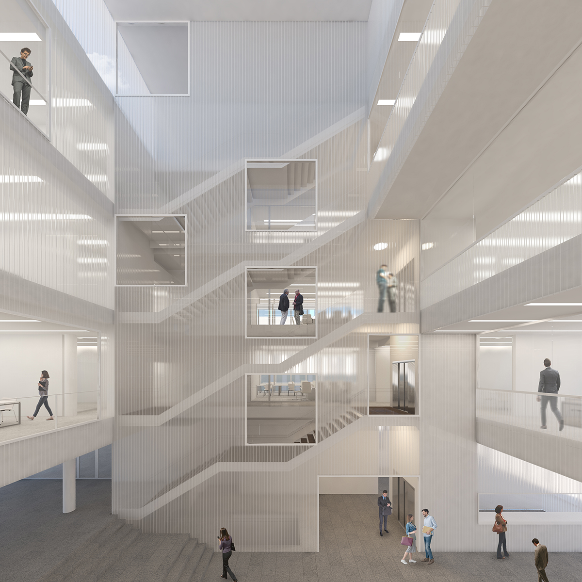 al gran vacío del atrio, hace posible comunicar las áreas de trabajo y circular