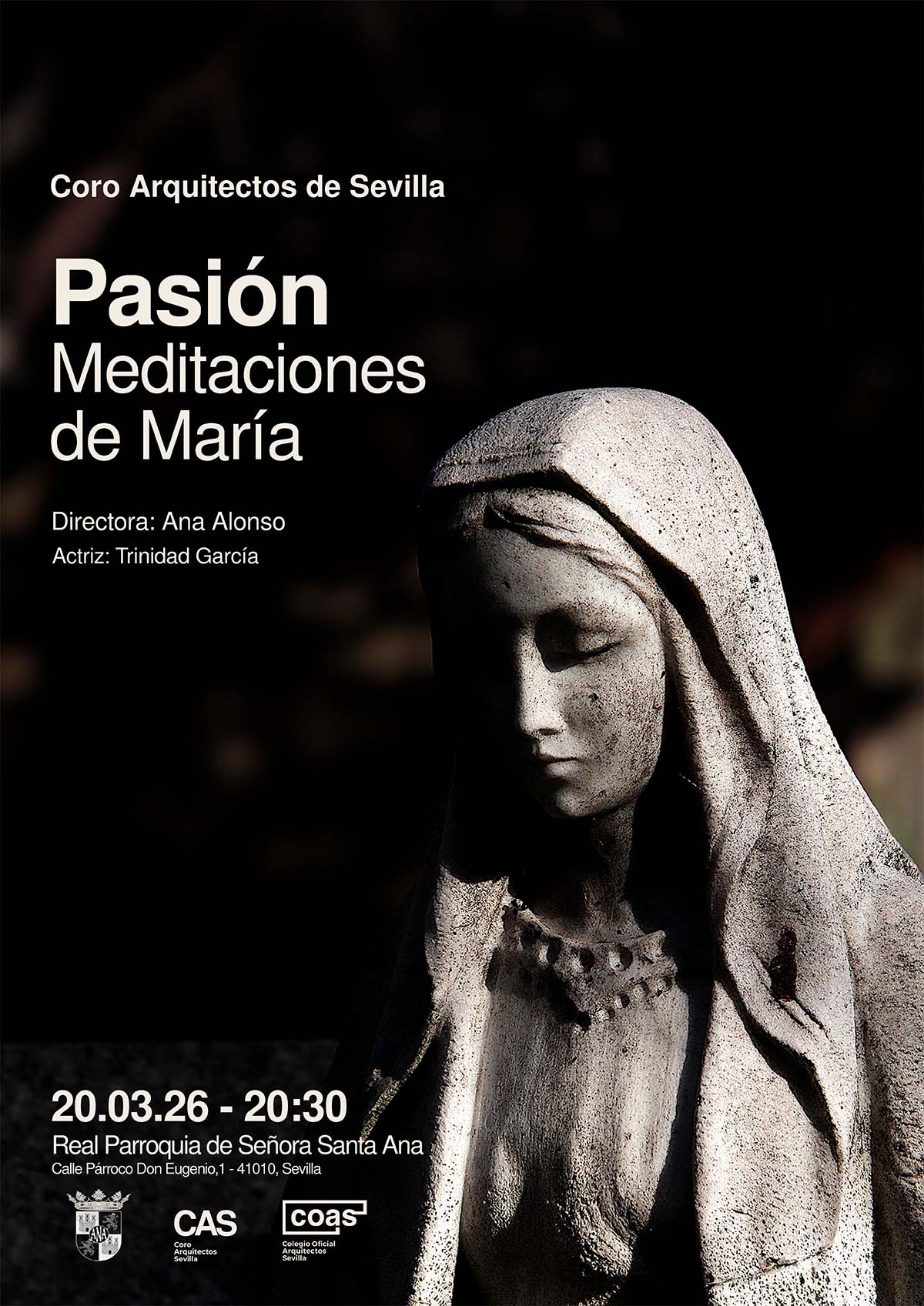 El Coro Arquitectos de Sevilla (CAS), dirigido por Ana Alonso, ofrecerá el próximo viernes 20 de marzo, a las 20:30 horas, el concierto “Pasión. Meditaciones de María”, que tendrá lugar en la Real Parroquia de Señora Santa Ana (Calle Párroco Don Eugenio, 1. Sevilla).