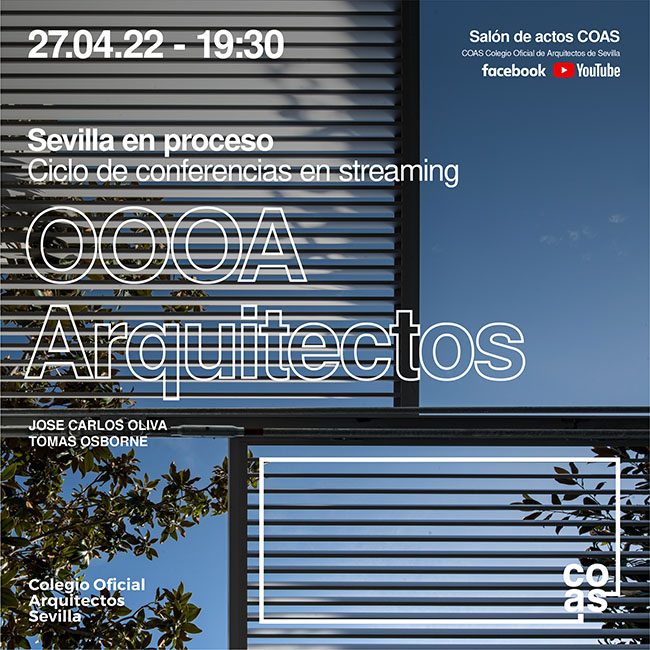 El próximo 27 de abril, miércoles, a partir de las 19:30 h., los arquitectos José Carlos Oliva y Tomás Osborne, de OOOA Arquitectos, impartirán una charla sobre sus trabajos más destacados dentro del ciclo de conferencias “Sevilla en proceso” que organiza el COAS dentro de su programa de actividades. Esta conferencia se podrá seguir en directo de forma presencial en la sede colegial (Plaza del Cristo de Burgos, 35), hasta completar el aforo habilitado, y también vía streaming.