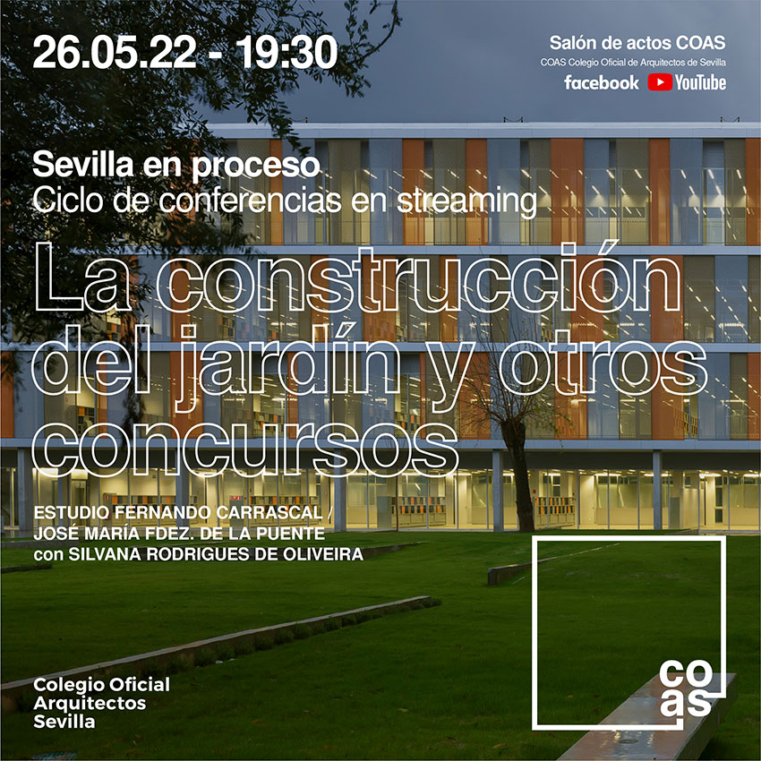 En el marco del ciclo de conferencias “Sevilla en proceso”, que organiza el COAS dentro de su programa de actividades, los arquitectos Fernando Carrascal, José María Fernández de la Puente y Silvana Rodrigues de Oliveira impartirán la charla ‘La construcción del jardín y otros concursos’ en el que analizarán sus trabajos más destacados. El encuentro tendrá lugar el jueves 26 mayo, a las 19:30 h., y será presentado por el arquitecto Gabriel Bascones de la Cruz.