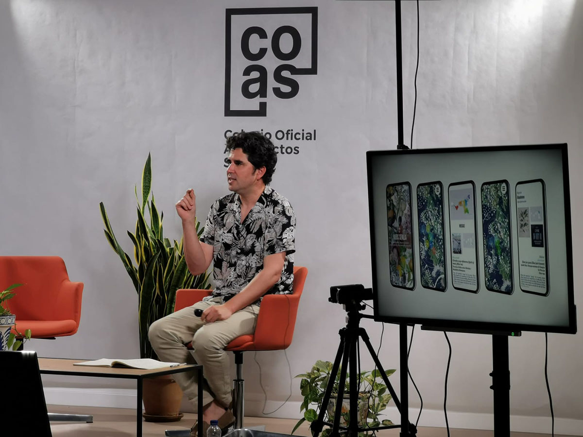 Juanma García Nieto, vocal de Actividades, fue el encargado de dar la bienvenida y presentar al protagonista: “Hoy tenemos a un invitado muy especial por la trayectoria de su estudio multidisciplinar, muy centrado en la ecología urbana, un campo absolutamente necesario, pero con una creatividad que resulta realmente inusual y que está situando a Nomad Garden en el panorama nacional en un punto bastante importante”, comentó.
