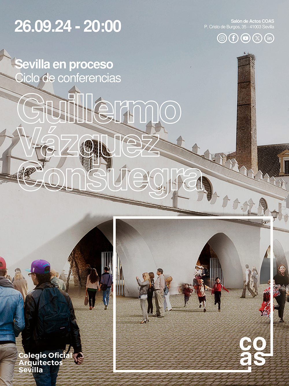 En el marco del ciclo de conferencias "Sevilla en Proceso", que organiza el COAS dentro de su programa de actividades, el arquitecto Guillermo Vázquez Consuegra impartirá una charla en la que hará un recorrido por su trayectoria y trabajos más recientes. El encuentro tendrá lugar el próximo jueves 26 de septiembre, a las 20 h.
