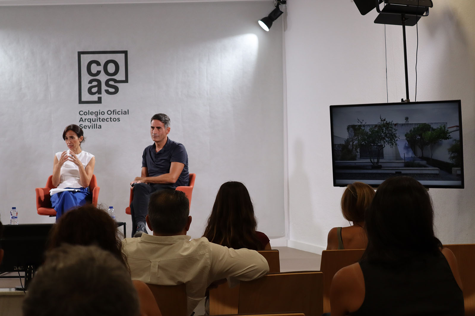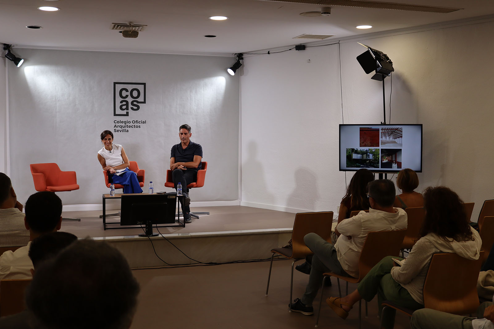 A continuación, tomaron la palabra Juanjo López de la Cruz y María González, quienes presentaron algunos de sus proyectos residenciales, como: Casa con dos patios y medio (Sevilla, 2022), Casa en el Mercado (Sevilla, 2012), Casa de los nueve pórticos (Castilleja de la Cuesta, 2022) o Casa 10x10 (Sevilla, 2020).