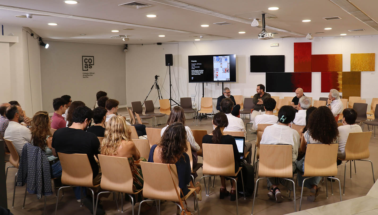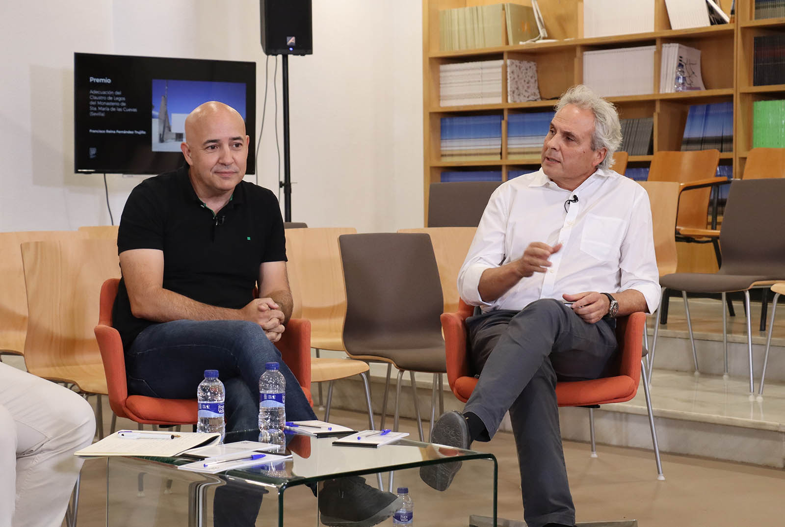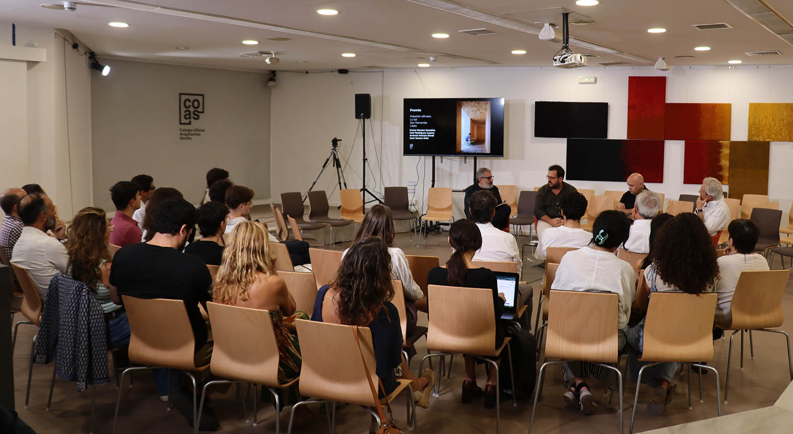 El encuentro, dinamizado por el crítico de arquitectura Fredy Massad, contó con la participación de Francisco Reina, Premio “Especial Sevilla” por la adecuación del Claustro de Legos del Monasterio de Santa María de las Cuevas; Antonio González Liñán, Premio “Nueva planta: uso residencial plurifamiliar” por las Viviendas sociales en Plaza de las Glòries (Barcelona), y José Rodríguez Lucena (CHS+R Arquitectos), Premio “Diseño interior y Arquitectura Efímera” por el Pabellón efímero La Sal en San Fernando (Cádiz).