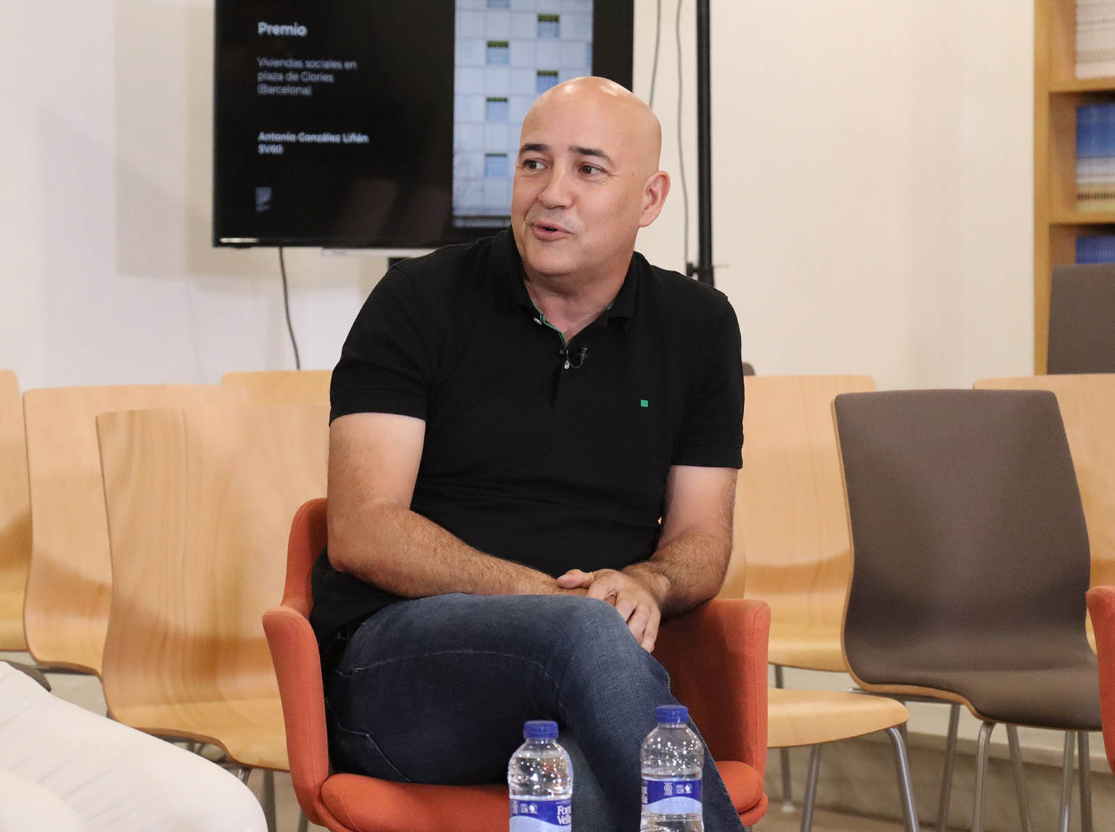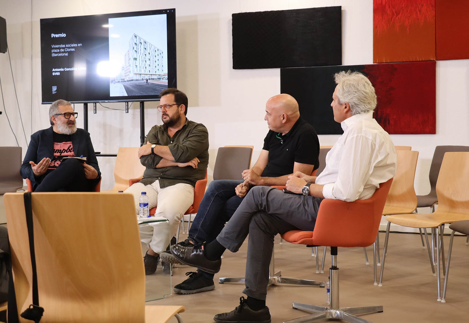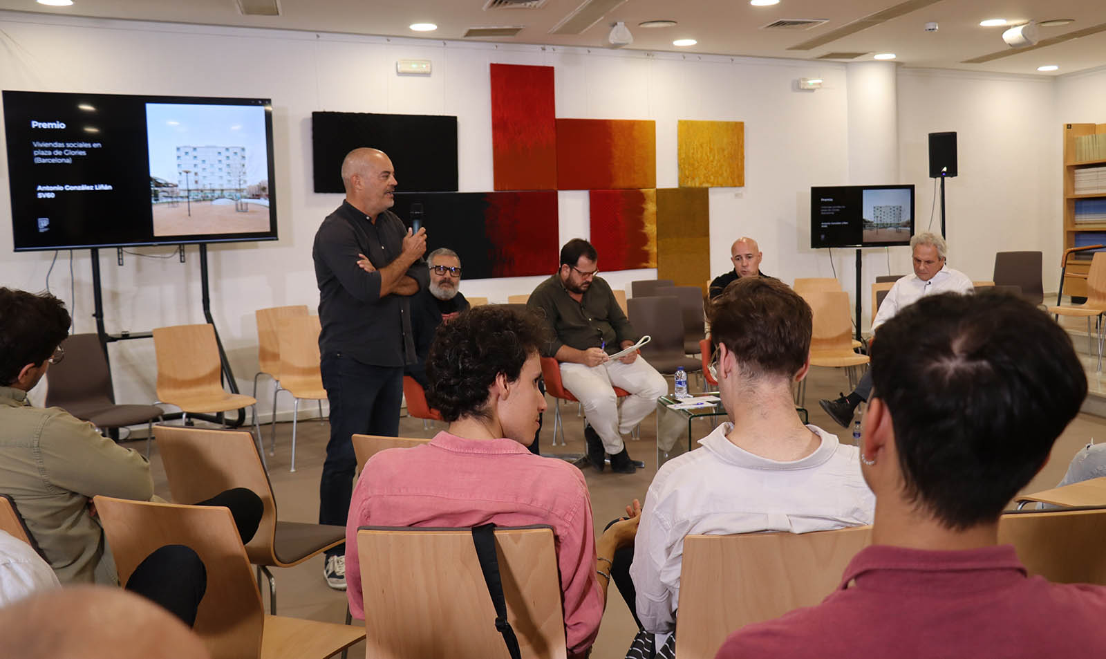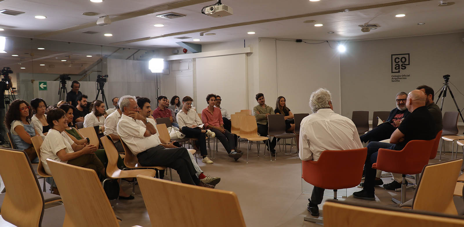 El encuentro, dinamizado por el crítico de arquitectura Fredy Massad, contó con la participación de Francisco Reina, Premio “Especial Sevilla” por la adecuación del Claustro de Legos del Monasterio de Santa María de las Cuevas; Antonio González Liñán, Premio “Nueva planta: uso residencial plurifamiliar” por las Viviendas sociales en Plaza de las Glòries (Barcelona), y José Rodríguez Lucena (CHS+R Arquitectos), Premio “Diseño interior y Arquitectura Efímera” por el Pabellón efímero La Sal en San Fernando (Cádiz).